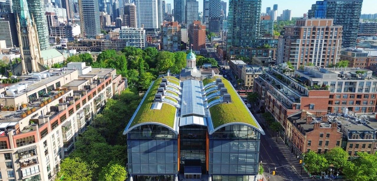 Der St. Lawrence Market prägt Torontos Zentrum seit dem frühen 19. Jahrhundert. Das jüngst fertiggestellte fünfstöckige Market North von RSHP und Adamson Associates bietet auf jeder Ebene öffentliche und private Nutzungen, verbunden durch ein gläsernes Atrium. Den oberen Abschluss bilden zwei extensive Tonnendächer über 1.500 Quadratmetern. Ausgerüstet mit Zinco Floraset FS 75 und Georaster gewährleisten sie Energieeinsparungen, Kühlung im Sommer, verbesserte Dämmung im Winter sowie effizientes Regenwassermanagement und urbane Biodiversität.